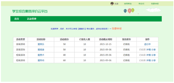 實踐活動:鼓勵學生積極參與學校組織的實踐活動,培養學生的獨立自主意識,創新能力,實踐活動結果支持學生之間互相點贊、教師評論,形成積分激勵機制;