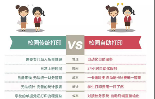 德凡智慧校園文印管理解決方案,以校園網為基礎,可實現“自助式無人化”的管理模式,通過校園一卡通或其他系統進行身份認證和費用結算,做到人員、使用時間、內容、費用的精確可控,一切都從用戶使用角度出發,為學校師生自助打印、復印、掃描提供全方位的服務與靈活計費方式,能滿足學校不同層次的需求。