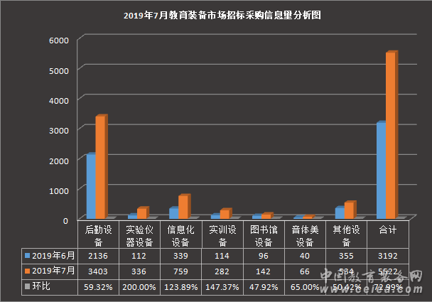 7月份,根據中國教育裝備網對國內教育裝備招中標采購信息量的數據統計,國內教育裝備市場招標采購信息總量為5522條,環比增長72.99%。由此可見,暑期的到來,使得國內教育裝備招標采購信息量呈現大幅增長的趨勢。