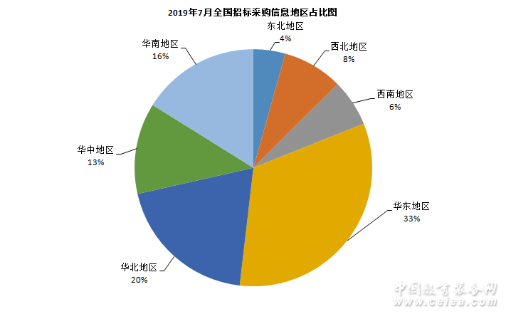 從7月招標采購信息地區統計圖(如圖3所示)和全國招標采購信息量地區占比圖(如圖4所示)可以看出:華東地區招標采購信息量為1809條,占比33%;華北地區招標采購信息量為1078條,占比20%;華南地區招標信息采購量為887條,占比16%;華中地區招標采購信息量為682條,占比13%;西北地區招標采購信息量為451條,占比8%;西南地區招標采購信息量為352條,占比6%;東北地區招標采購信息量為239條,占比4%。