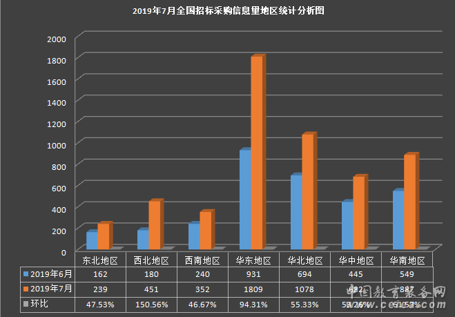 綜合7月全國招標采購信息量地區統計分析圖(如圖5所示):西北地區環比增長150.56%;華東地區環比增長94.31%;華南地區環比增長61.57%;華北地區環比增長55.33%;華中地區環比增長53.26%;東北地區環比增長47.53%;西南地區環比增長46.67%。