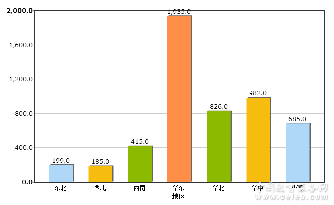 從7月中標信息地區統計圖(如圖8所示)和全國中標信息地區占比圖(如圖9所示)來看:華東地區中標信息量為1935條,占比37%;華中地區中標信息量為982條,占比19%;華北地區中標信息量為826條,占比16%;華南地區中標信息量為685條,占比13%;西南地區招中標信息量為415條,占比8%;東北地區中標信息量為199條,占比4%;西北地區中標信息量為185條,占比3%。
