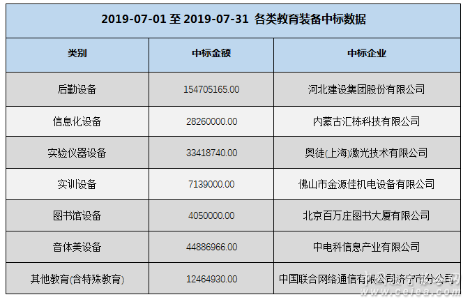 附:2019年7月已有教育裝備類別數據中累積最高中標金額及其所屬企業。