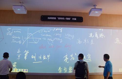 光峰科技超級“投影機+海板”投影方案:兩臺光峰超短焦高清高亮投影機融合,投射出250吋的大畫面,滿足大型教室、會議室、階梯教室的需求。應用ALPD激光顯示技術,亮度高達5500的流明,不懼環境光,即使在明亮的環境中,也能夠讓學生看到清晰亮麗的畫面,讓教學更精彩。