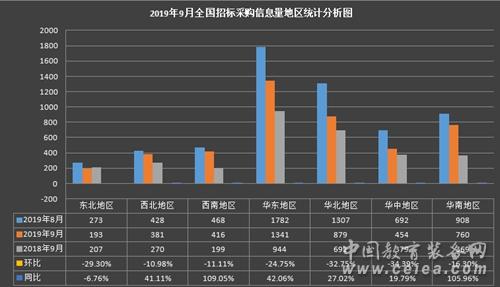 綜合9月全國招標(biāo)采購信息量地區(qū)統(tǒng)計分析圖(如圖5所示):西北地區(qū)環(huán)比下降10.98%,同比增長41.11%;華東地區(qū)環(huán)比下降24.75%,同比增長42.06%;華南地區(qū)環(huán)比下降16.30%,同比增長105.96%;華北地區(qū)環(huán)比下降32.75%,同比增長27.02%;華中地區(qū)環(huán)比下降34.39%,同比增長19.79%;東北地區(qū)環(huán)比下降29.30%,同比下降6.76%;西南地區(qū)環(huán)比下降11.11%,同比增長109.05%。