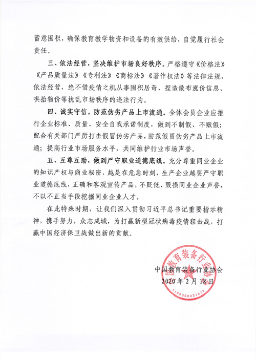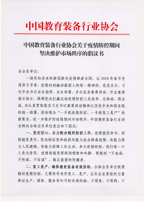 中國教育裝備行業協會關于疫情防控期間堅決維護市場秩序的倡議書