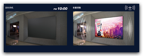 透過區網可控制例如定時關機, 調整音量, 訊源切換等功能, 提升營運效率