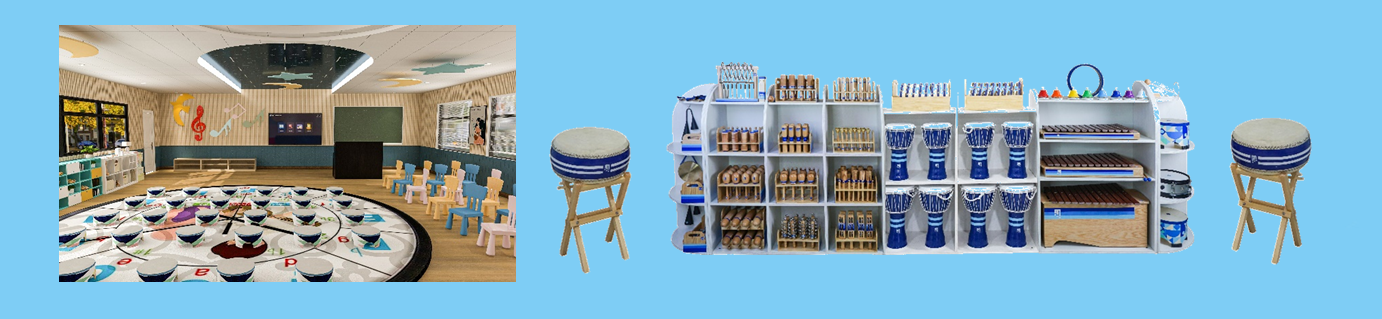 教室設計定位主要是面向零基礎的中小學生,重點培養學生對于打擊樂的學習興趣,增加對打擊樂相關知識、內容的了解,配以數字化的音樂教學設備,提高老師的教學效率。