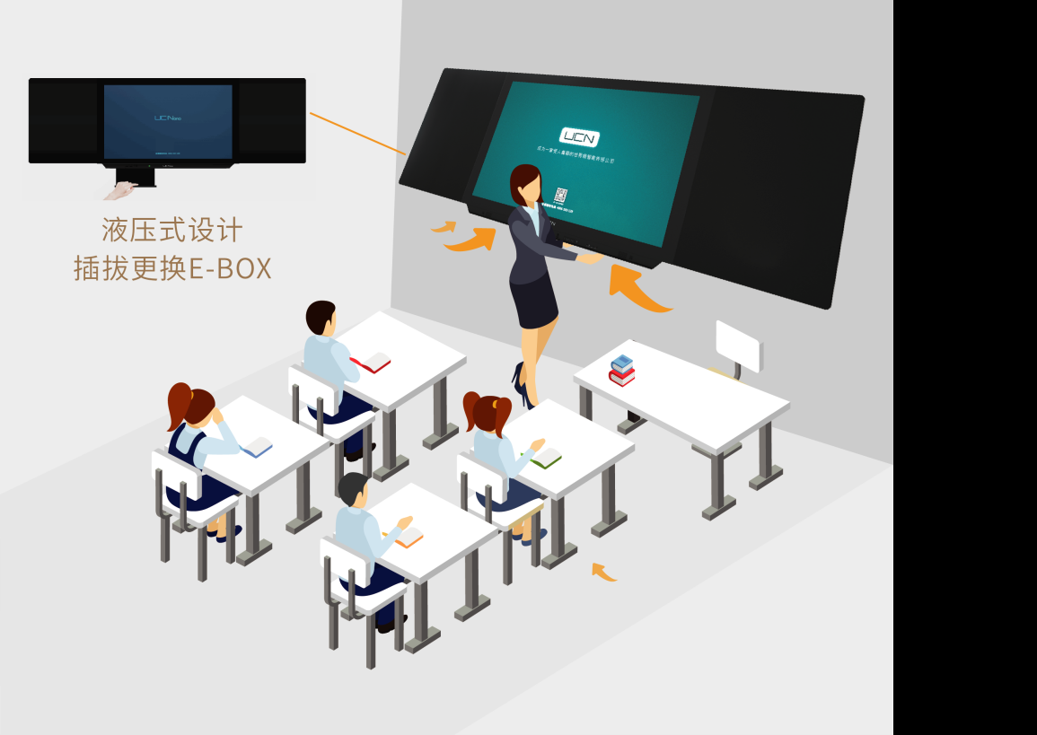 Box設計,將視頻卡、OPS等易損部件全部集成在一個小盒子里,如果出現(xiàn)故障,只需直接拉出更換備份E-Box。無需等待上門維修服務,不耽誤學校正常教學活動。
