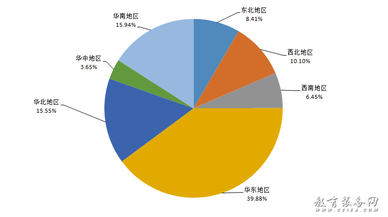 9月份教育裝備中標(biāo)采購(gòu)區(qū)域信息數(shù)據(jù)共3613條(中標(biāo)信息區(qū)域設(shè)置為單選項(xiàng))見(jiàn)圖6、圖7,華東地區(qū)中標(biāo)信息量1441條,占區(qū)域信息量的39.88%;華南地區(qū)中標(biāo)信息量576條,占區(qū)域信息量的15.94%;華北地區(qū)中標(biāo)信息量562條,占區(qū)域信息量的15.55%;西北地區(qū)中標(biāo)信息量365條,占區(qū)域信息量的10.10%;東北地區(qū)教育裝備中標(biāo)信息量304條,占區(qū)域信息量的8.41%;西南地區(qū)中標(biāo)信息量233條,占區(qū)域信息量的6.45%;華中地區(qū)中標(biāo)信息量132條,占區(qū)域信息量的3.65%。