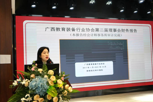 張珊會長向大會報告二屆理事會工作情況。她全面總結了協會4年來取得的成就:一、把握正確的政治導向,堅定永跟黨走的信念,行業內風清氣正;二、為行業和會員服務,引領教育裝備發展方向:打造專業品牌展會,打造玉蘭路小學、相思湖學校兩所示范園校,打造教育裝備展示體驗中心,為企業搭建橋梁;三、服務課堂教學,把裝備應用工作作為重點工作之一,組織多種形式的學術論壇和研討會,協助區教育廳、教研院組織教師技能培訓,提高教師的專業素養;四、承擔社會責任,開展公益捐贈,4年來共為廣西各級教育部門捐贈教學儀器達3000多萬元;五、優化內部組織結構,設立了3個分會和1個專業委員會,充分發揮分會的優勢,使協會工作更細化,管理更深化,效能更優化;六、為外地的教育裝備廠家架設了與廣西教育部門的橋梁,助力外地企業在廣西市場的開拓。