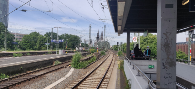 圖1 在展館附近下火車。右邊可見科隆展覽中心的展館建筑,遠處即為著名的科隆大教堂