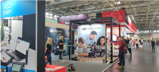 老牌職教企業FESTO依然占據最大的職教展位。后來評選出的明星企業Promethean的展位并不太大,當時給筆者留下更深印象的交互式學習設備展商是一家總部設在杜塞爾多夫的日資企業(圖7)。而慧魚這樣的著名企業只有一個展位,奧地利的老朋友——學生用智慧機床的廠商Cool Tool公司(圖8)也只有兩個半展位而已。值得注意的是唯一參展的中國廠家大疆教育(圖9),他們本次展會上推出了大疆教育機器人和無人機,吸引了很多觀眾。但大疆展臺上都是德國員工,應該是大疆德國公司的雇員。