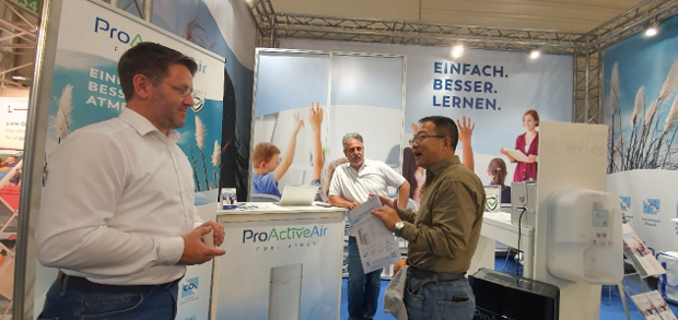 筆者在本次展會上發現了一家從事校園衛生工作的公司——ProActiveAir,他們主要開發和推廣空氣凈化設備(圖12)。研究了一下,其技術路線主要采用國內比較常見的過濾+等離子技術,主要是借助物理方法進行室內空氣凈化。因雙方在校園衛生方面有高度共識,因此交流十分順暢,筆者也介紹了本公司的二氧化氯空氣消毒技術,期望能夠有所合作。