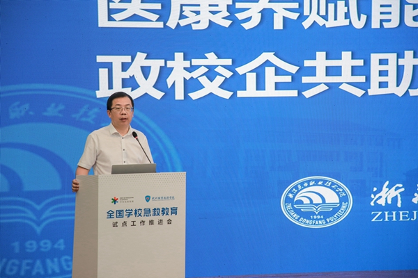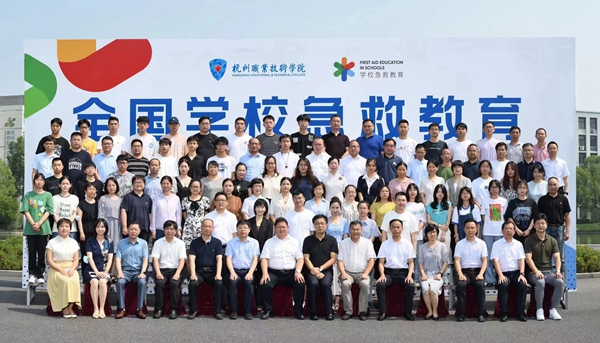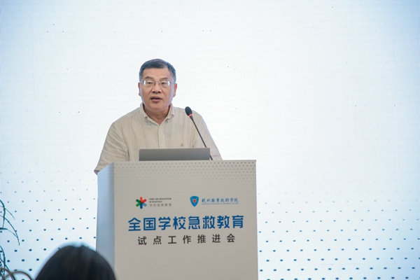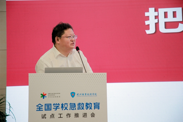 7月25日,全國學校急救教育試點工作推進會在杭州職業技術學院舉行。教育部體育衛生與藝術教育司體育與衛生教育處副處長樊澤民,中國教育裝備行業協會常務副會長夏國明,浙江省教育廳體衛藝處處長李建章,浙江省紅十字會黨組成員、專職副會長黃元龍,杭州市教育局黨委委員、副局長高寧,杭州市紅十字會黨組成員、二級巡視員譚湘,全國校園急救教育試點工作辦公室副主任李夢瑩、王艷,杭州職業技術學院校長徐時清、副校長樓曉春以及浙江省各試點學校相關負責人出席會議。會議以線上線下相結合形式召開,并覆蓋全國各試點校。
