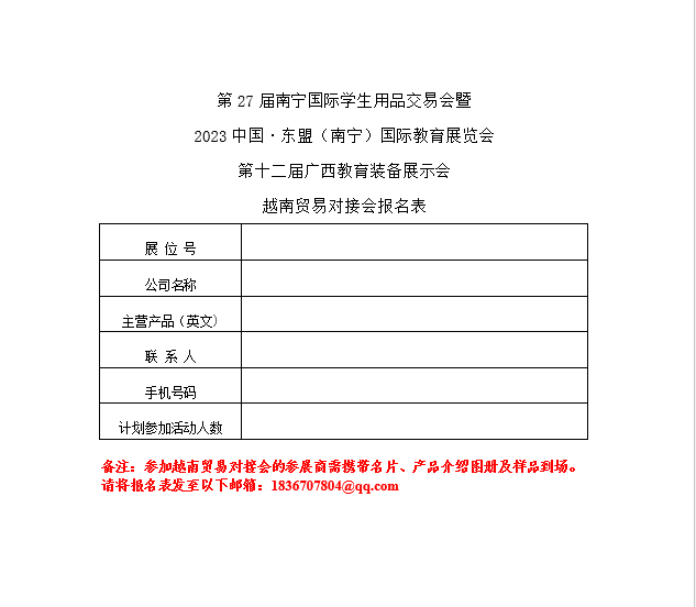 利用廣西獨特的區位優勢,推動與廣西乃至東盟、RCEP地區教育事業交流與合作。在廣西教育裝備行業協會與學交會組委會各主辦方的共同協作下,今年第十二屆廣西教育裝備展示會現場將舉辦中越教育裝備貿易對接會,歡迎各位展商踴躍報名。(活動聯系人曾老師18074922725,報名表見二維碼)