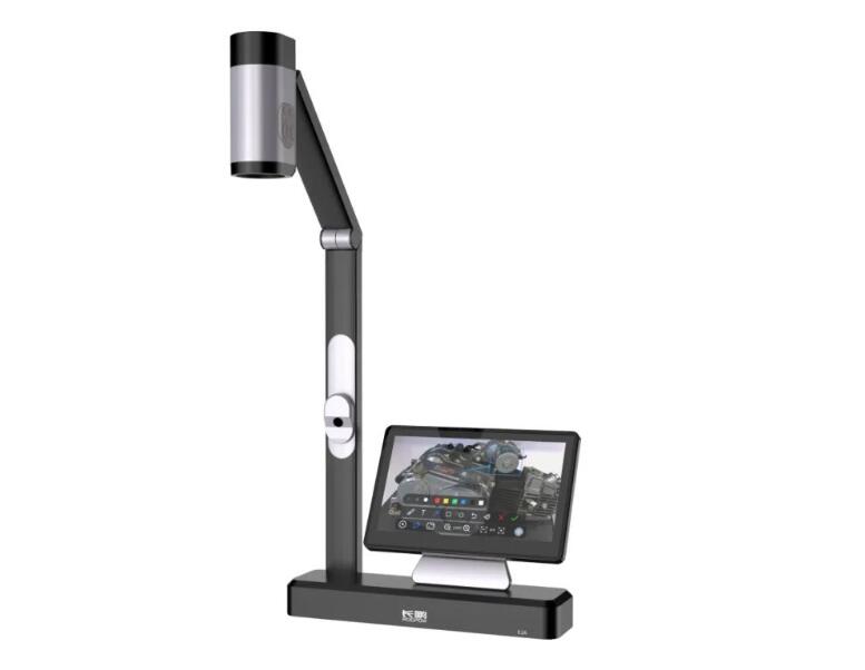 本次長鵬推出最新一代自研一桿雙攝示教終端,采用俯拍圓柱形一體化流線型設計,內置4K超高清攝像機,集成TOF、12倍光學變焦鏡頭,能自動追焦被攝物體,實現快速精準聚焦。讓老師在示范互動教學中更高效,更便捷。