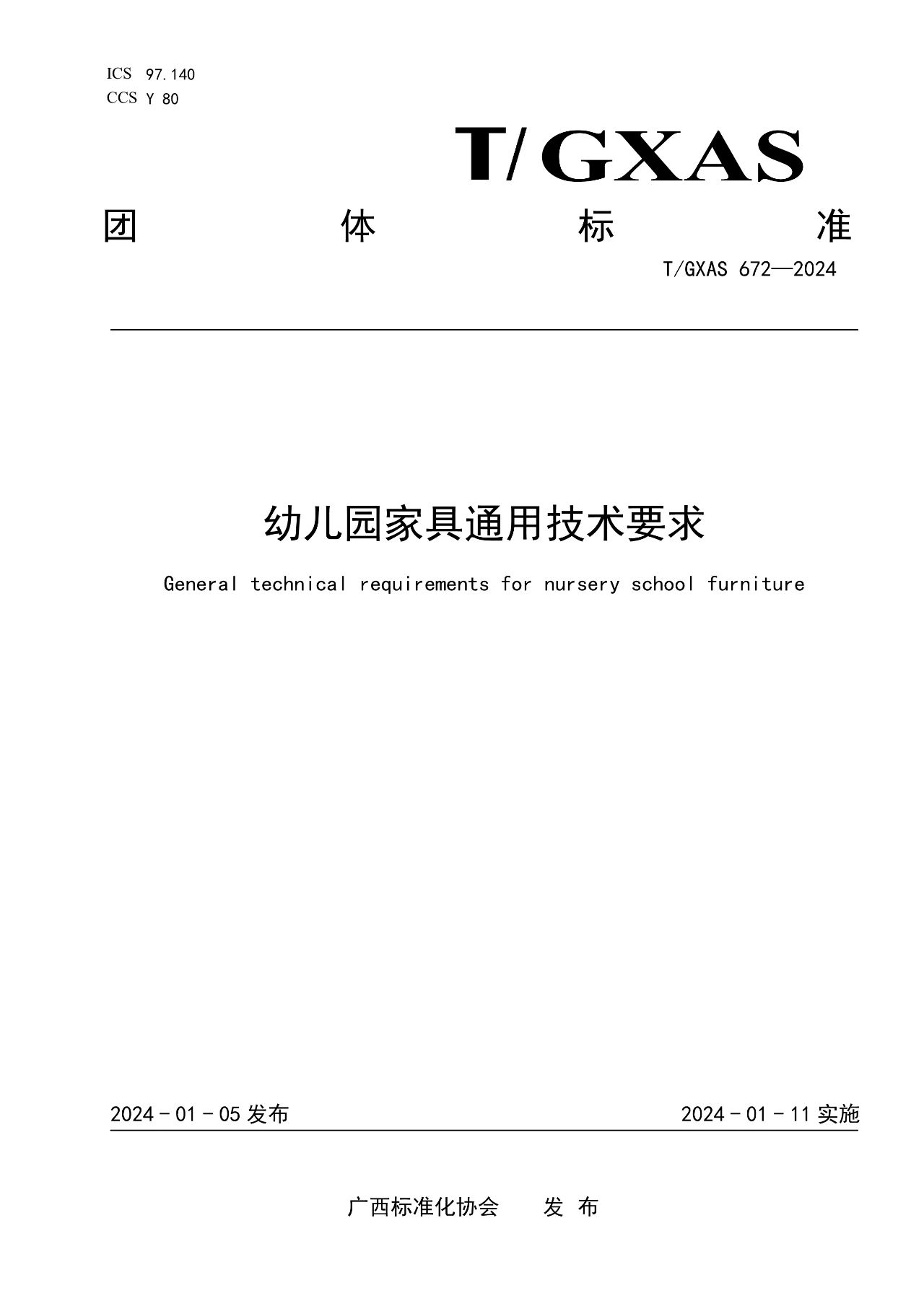 2024年1月12日,由廣西教育裝備行業(yè)協(xié)會牽頭,壯童教育設(shè)備(廣西)有限公司、廣西博童教育發(fā)展有限公司、南寧四軒科教辦公用品有限公司、廣西幼兒師范高等專科學(xué)校、廣西教育裝備行業(yè)協(xié)會、廣西托幼行業(yè)產(chǎn)教融合共同體、廣西壯族自治區(qū)衛(wèi)生健康委員會幼兒園、廣西軍區(qū)幼兒園、南寧高新技術(shù)產(chǎn)業(yè)開發(fā)區(qū)梅沙幼兒園等單位共同起草的團(tuán)體標(biāo)準(zhǔn)《幼兒園家具通用技術(shù)要求》正式發(fā)布。