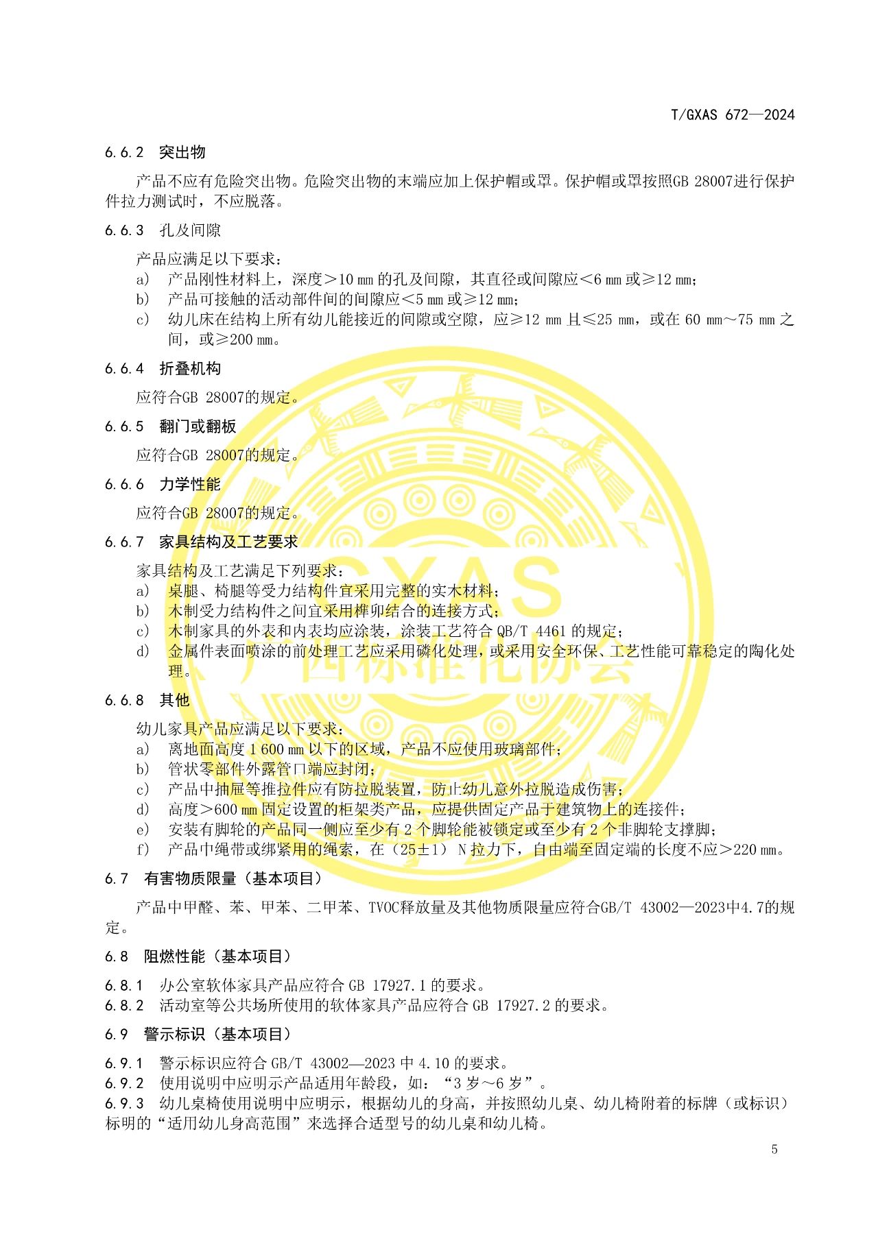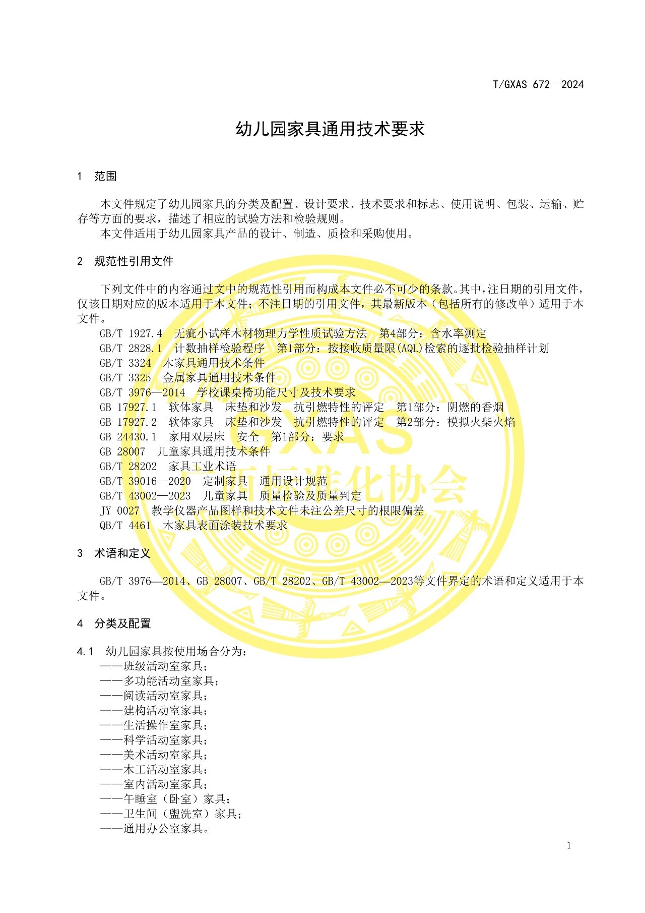 《幼兒園家具通用技術(shù)要求》團(tuán)體標(biāo)準(zhǔn)規(guī)定了幼兒園家具的術(shù)語和定義,涵蓋了幼兒園家具的產(chǎn)品分類及配置、設(shè)計(jì)要求、技術(shù)要求、試驗(yàn)方法、檢驗(yàn)規(guī)則、標(biāo)志、使用說明、包裝、運(yùn)輸和貯存。其主要技術(shù)內(nèi)容包括外觀、材料理化性能、有害物質(zhì)限量、阻燃性能、警示標(biāo)識、家具安裝等。