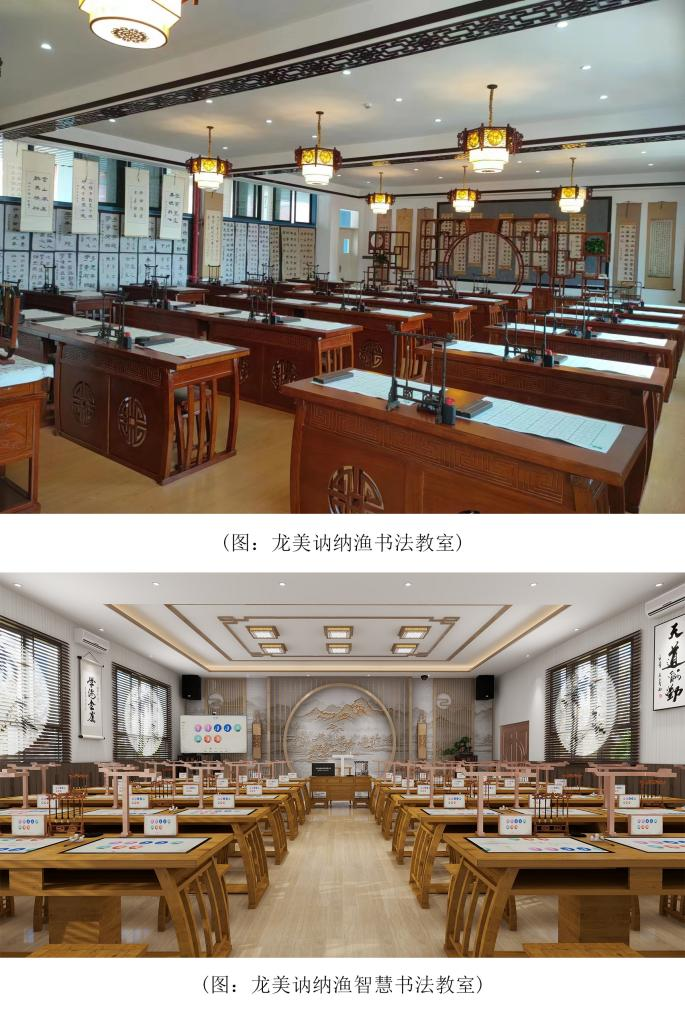 龍美訥納漁書法教室是在完整保留傳統書法學習功能的基礎上,以書法基礎練習為核心,教師和學生均配備有榫卯結構純實木古典書法桌,毛筆、筆擱、筆洗、鎮尺、硯臺、宣紙、毛氈等書法用具,打造高標準專業書法教室,可滿足各學段書法課程的授課與學習。且對書法教室空間進行了精心設計布局和裝飾,營造出濃厚的書法藝術氛圍。讓學生在學習過程中自然而然地沉浸其中,感受書法的獨特魅力。
