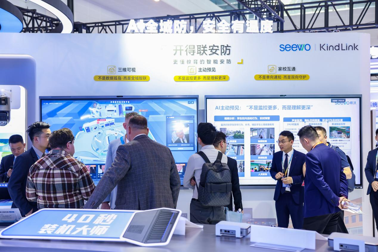希沃推出“更懂教育的智能安防”——開得聯安防方案,展會現場啟動,實時監測統計展位現場的來往人流。希沃智能安防利用AI技術連同“空間-設備-數據”,進行危險信號的智能識別、學生數據畫像等,將校園安全及時反饋教師與家長。