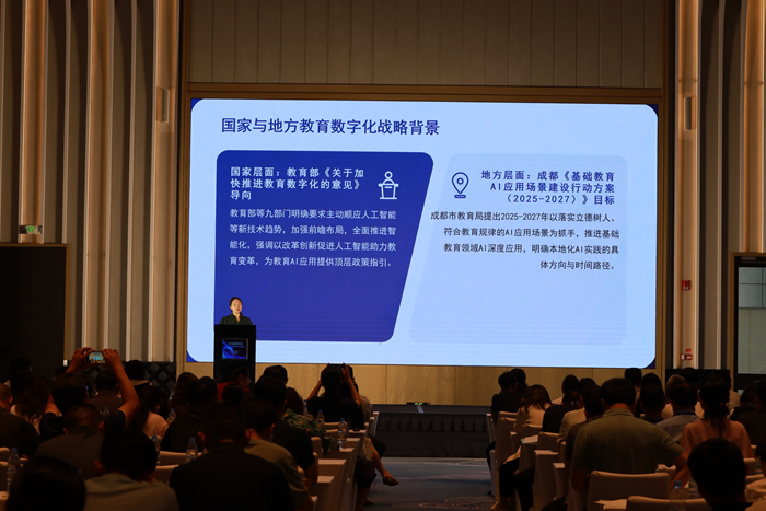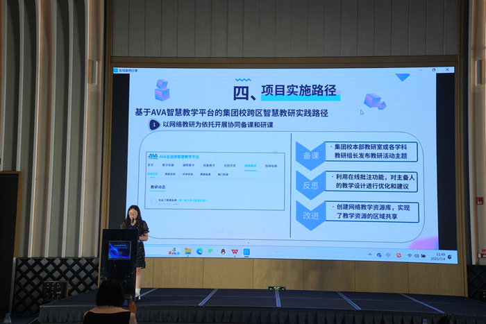 在案例分享環(huán)節(jié),山東省淄博市教育局總督學(xué)、三級調(diào)研員趙志遠(yuǎn)在《全環(huán)境數(shù)字生態(tài)視域下教育數(shù)字化轉(zhuǎn)型的實踐探索》報告中,以系統(tǒng)思維生動詮釋了“全域性”(空間覆蓋的全域性、教育鏈條的全域性和生態(tài)要素的全域性)在教育數(shù)字化轉(zhuǎn)型中的價值;四川省成都市教育技術(shù)裝備管理中心副主任倪宏所作的《成都教育AI應(yīng)用孵化園平臺建設(shè)實踐》報告,以國家教育數(shù)字化戰(zhàn)略為引領(lǐng),系統(tǒng)闡述了成都教育AI孵化園建設(shè)實踐,對區(qū)域教育AI生態(tài)構(gòu)建、推動基礎(chǔ)教育數(shù)字化轉(zhuǎn)型具有重要參考價值;河南省濮陽縣教育資源保障中心副主任邢寧在《從基礎(chǔ)設(shè)施到教學(xué)創(chuàng)新:濮陽縣智慧教育深度融合的數(shù)字化轉(zhuǎn)型和城鄉(xiāng)優(yōu)質(zhì)均衡發(fā)展之路》主題分享中,以濮陽縣智慧教育實踐為樣本,詳細(xì)闡述了從基礎(chǔ)設(shè)施升級到教學(xué)創(chuàng)新的全鏈條探索;山東省濟(jì)寧市教育技術(shù)裝備服務(wù)中心主任韓瑾以《探索中小學(xué)實驗室安全“4S”管理體系 推動學(xué)校危險化學(xué)品安全管理創(chuàng)新》為題,介紹了如何從采購、管理、使用到處置全鏈條構(gòu)建中小學(xué)實驗室安全管理體系;四川省巴中市南江縣南江中學(xué)黃鶴老師分享的《基于生成式人工智能的STEAM教育實踐——以班歌創(chuàng)編與智能機(jī)器人展演為例》生動、系統(tǒng)地呈現(xiàn)了“AI助創(chuàng)班歌+機(jī)器人編程”案例的活動方案、實施流程與成果,該案例將語文、音樂、數(shù)學(xué)、信息科技等多學(xué)科融合,借助AI創(chuàng)作工具提高學(xué)生的創(chuàng)造力和科學(xué)思維能力;內(nèi)蒙古自治區(qū)烏海市烏達(dá)區(qū)實驗中學(xué)胡娜老師所作的《智慧教室賦能地域文化教學(xué)創(chuàng)新——基于數(shù)字校園環(huán)境的“Beautiful Wuhai”項目化教學(xué)實踐》報告分享了一個頗具創(chuàng)新性的實踐項目,該項目緊密結(jié)合地域文化特色,展現(xiàn)技術(shù)賦能文化教學(xué)的魅力;青海省西寧市第二中學(xué)李元英老師分享的《巧循數(shù)字化為“徑”,助推教育集團(tuán)協(xié)同教研邁入智慧之“境”》為跨區(qū)教研活動找到了一條創(chuàng)新之路,基于AVA智慧教學(xué)平臺推動教研活動精準(zhǔn)實施;陜西省延安市吳起縣教育體育局齊應(yīng)楠老師分享的《教育網(wǎng)絡(luò)架起希望之橋——吳起縣教育網(wǎng)絡(luò)建設(shè)應(yīng)用與實踐案例》,讓人們看到了吳起縣以教育網(wǎng)絡(luò)為筆,在黃土高原腹地繪就的教育信息化美麗畫卷,為實現(xiàn)教育公平和質(zhì)量提升架起了希望之橋。