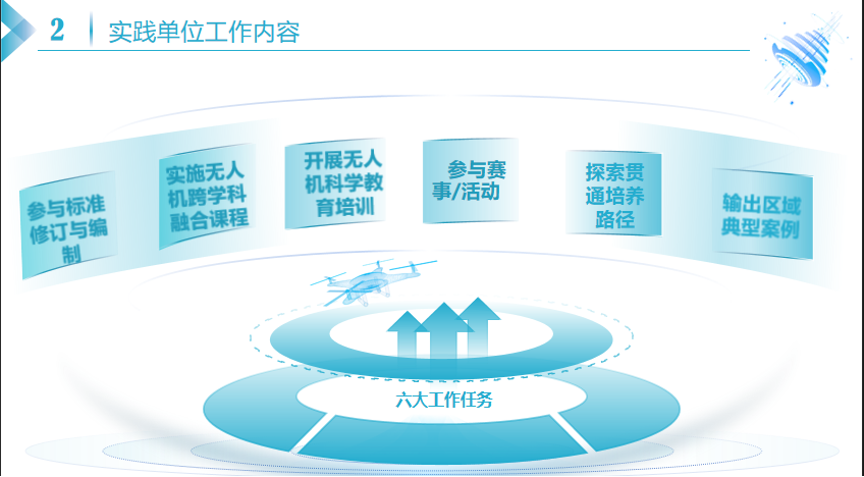 項目推進人姚春艷詳細介紹了實踐區與實踐單位的工作規劃。她指出,實踐單位將圍繞六大任務開展工作,即參與標準修訂與編制,實施無人機跨學科融合課程,開展無人機科學教師培訓,參與賽事活動,探索貫通培養路徑及輸出典型案例。