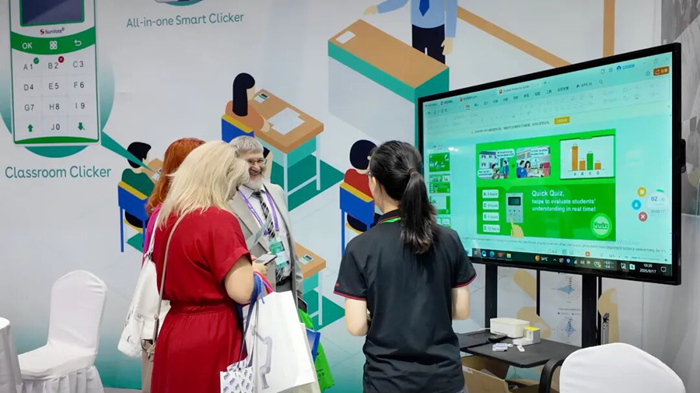 展會現場,易教團隊用覆蓋全學段的真實教學案例與鮮活直觀的教學數據為支撐,向來自多個國家的教育工作者生動闡釋了中天易教如何依托數字化技術,解決課堂教學互動效率不足、教學效果評估滯后等行業痛點。