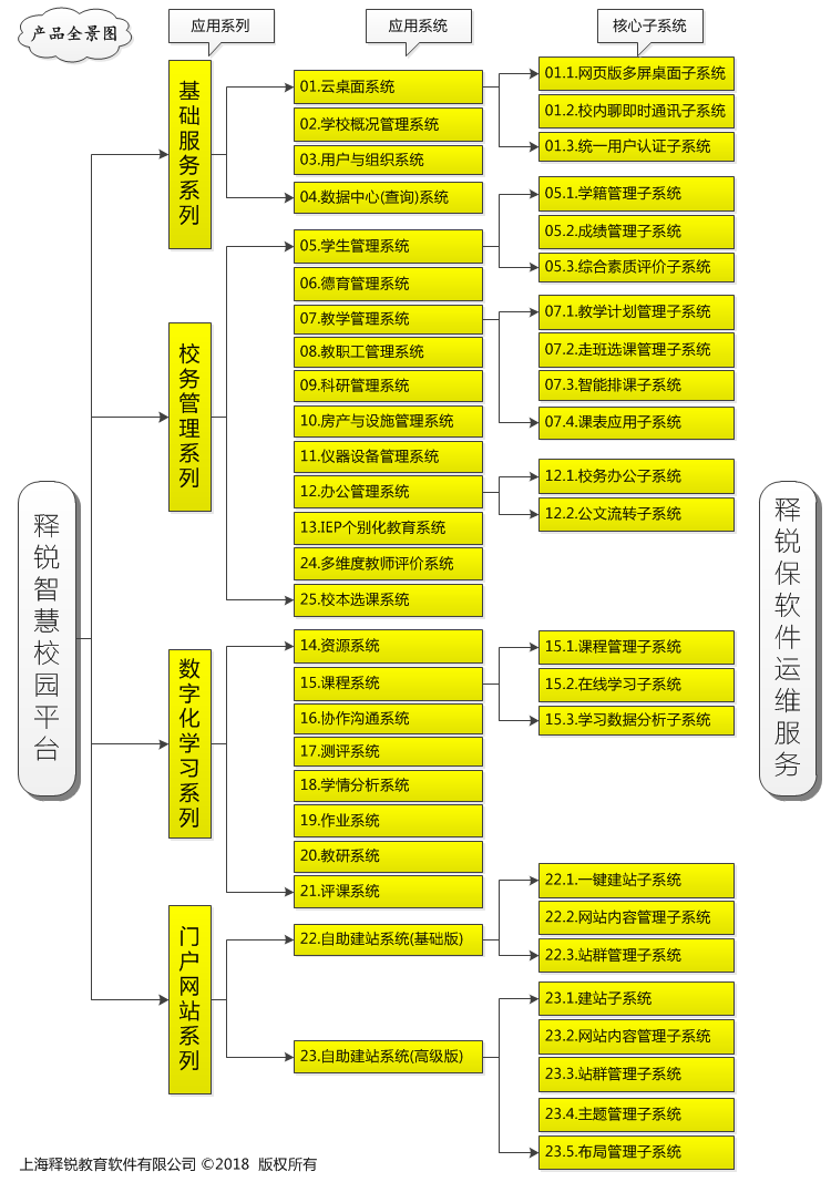• 國際化技術,本土化標準,模塊化設計,4個系列、25個系統、60個應用,建設智慧校園,找釋銳一家就夠了。詳見《產品全景圖》