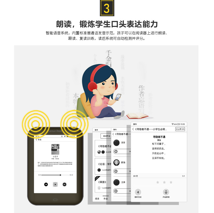 7.學生端APP系統:完成閱讀能力評測、自由朗讀、聽書、完成朗讀作業閱讀作業評測、書圈閱讀互動、書城、閱讀簽到等功能。