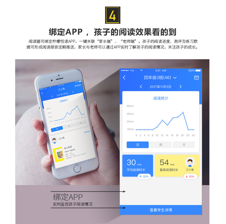 9.家長端APP系統:實時查看孩子閱讀報告;實時查看孩子作業報告;實時掌握孩子社圈交流情況反饋;學生端家長管控功能;書城功能,與孩子共同閱讀。
