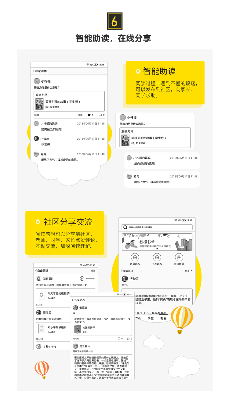 5.智能分級互動模塊:書籍簡介評論中點贊互動;班級動態中與同班同學交流互動;書友動態中與看過同樣書籍的書友交流互動;自由朗誦中對朗動錄音點贊評論