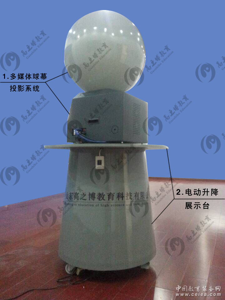 產(chǎn)品詳細(xì)介紹1.多媒體球幕投影演示系統(tǒng),是高之博根據(jù)教育部最新頒布的裝備標(biāo)準(zhǔn)及新課程標(biāo)準(zhǔn)而自主研發(fā)的一款將計(jì)算機(jī)信息技術(shù)應(yīng)用到初中、高中地理學(xué)教學(xué)中的一種現(xiàn)代化數(shù)字示教平臺(tái)。 2.它可分為兩個(gè)部分:①硬件系統(tǒng):球型屏幕、魚眼鏡頭、投影機(jī)、遙控器等;②軟件系統(tǒng):平臺(tái)軟件、配套新課標(biāo)課程包和指導(dǎo)手冊(cè)。 多媒體球幕投影演示系統(tǒng)非常直觀形象、全方位的展示球體教學(xué)內(nèi)容,既可以演示宇宙中各天體和星體(如:太陽系八大行星等),也可以演示地理知識(shí)(如:模擬海水抽干,氣壓帶分布、云系運(yùn)動(dòng)、麥哲倫航線、洋流等)。該產(chǎn)品完全改變了傳統(tǒng)模型教具的單一性及缺乏趣味性的互動(dòng)演示模式,為師生互動(dòng)教學(xué)增添新意,極大的滿足教學(xué)應(yīng)用需要,大大提高了教學(xué)的效果與質(zhì)量,使教學(xué)倍加輕松。另外,該產(chǎn)品還能與電子白板、數(shù)字立體地形、環(huán)幕示教系統(tǒng)、大屏幕液晶電視等多媒體設(shè)備無縫聯(lián)動(dòng)對(duì)接,使產(chǎn)品教學(xué)應(yīng)用市場的前景更為廣泛。 目前,多媒體球幕投影演示儀已列入教育部最新頒布的《中華人民共和國教育行業(yè)標(biāo)準(zhǔn)》 (編號(hào)JY28004) 政策及技術(shù)優(yōu)勢(shì) 1、數(shù)字化地理專用教室和數(shù)字化科學(xué)教室的核心設(shè)備 2、專家聯(lián)手打造配套新課標(biāo)課程,為教學(xué)設(shè)置二次開發(fā)平臺(tái) 3、列入最新頒布的《中華人民共和國教育行業(yè)標(biāo)準(zhǔn)》(編號(hào):JY28004) 4、國際領(lǐng)先球面成像技術(shù)制造者 5、行業(yè)領(lǐng)先的高清高亮的多媒體球幕投影演示儀 6、全高清分辨率,清晰度是標(biāo)清產(chǎn)品的2.4倍 7、特制全高清地理課件,顯示效果大大提升 資源中心包含了初高中新課標(biāo)教學(xué)要求的所有課程素材以及部分拓展素材資源,每學(xué)期至少一次通過自主研發(fā)的資源更新平臺(tái),為用戶平滑推送最新素材資源,同時(shí)也可實(shí)時(shí)在線自主下載所需資源。