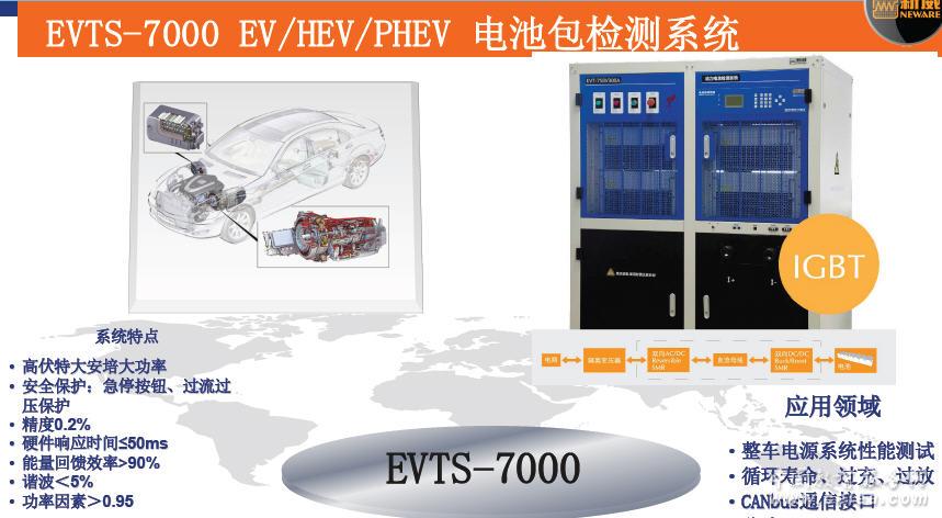 產品詳細介紹產品簡介: ① EVT-7000主要面向大電池包的檢測,作為新一代高電壓大電流動力電池檢測系統,核心的功率器件采用IGBT(絕緣柵雙極型晶體管),區別于傳統功率器件與控制方法,測試控制更加穩定可靠,是動力電池、儲能電池理想的系統化解決方案。 應用領域 項目 應用領域 ①性能測試: 電壓、電流、容量、能量/功率輸出能力 ②電池性能測試: 循環壽命、過充、過放 ③分選: 電池組內單體一致性測試與評估 ④CAN bus通信接口: 支持與BMU/BMS通信 ⑤倍率測試: 倍率充電測試、倍率放電測試 ⑥放電能量: 純正弦回饋電網 技術指標 項目 技術指標 ①輸出范圍(可定制): 電壓:100~800V 電流:±1000A 功率:800KVA ②分辨率: AD: 16bit; DA: 12bit ③控制精度: ±0.2% of FS ④測量精度: ±0.2% of FS ⑤硬件響應時間: 電流(10%~90%)響應時間≦1s ⑥數據記錄: 1Hz, 10Hz(可定制) , 支持△t/△U/△/I作為記錄條件 ⑦持模式: 充電:CCC,CVC, CC&CVC, 放電:CCD, CPD ⑧回饋效率: ﹥90% ⑨諧波: ﹤5% |