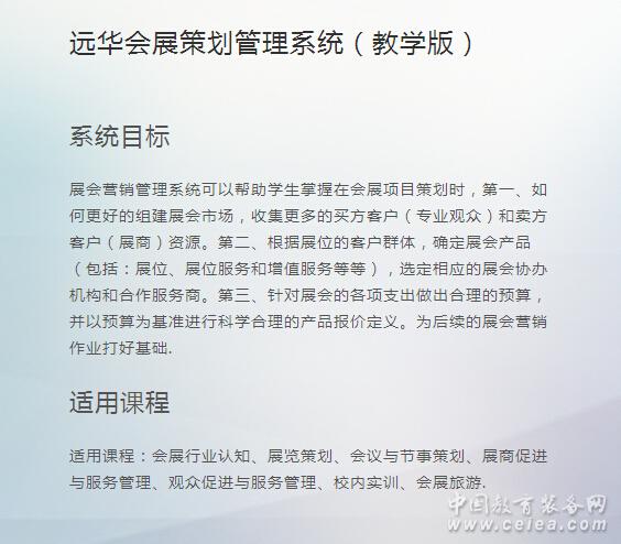 適用課程:會展行業認知、展覽策劃、會議與節事策劃、展商促進與服務管理、觀眾促進與服務管理、校內實訓、會展旅游.