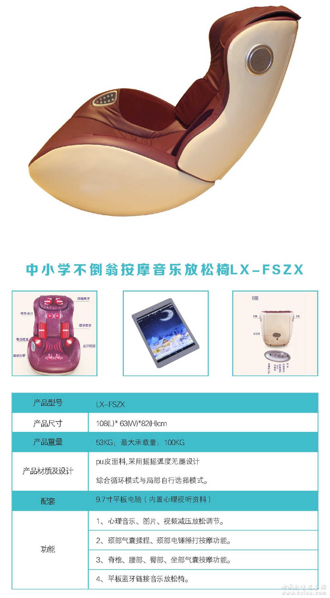 產品詳細介紹中小學心理輔導室設計方案,中小學音樂放松椅廠家心理產品器材,特殊學校心理 產品描述: 1.不倒翁式音樂按摩椅: a.功率:60瓦 b.凈重:38KG c.氣囊:20個 d.電磁閥:8個 e.面料:pu椅子采用搖搖弧度無腿設計。