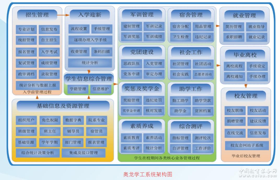以學生為中心,為學生提供各項服務,服務階段包括入學前、入學時、在校期間、畢業時、畢業以后,提供對學生全過程生命周期的管理。