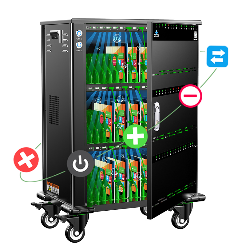 產(chǎn)品詳細介紹品牌:際慶科技 型號:SYNC48 Sync 48 招投(應(yīng)標)參數(shù): 功能參數(shù): 1、48口直流充電USB 5V2.4A且每口穩(wěn)定兼容HUB數(shù)據(jù)傳輸功能并對應(yīng)配48條綠色數(shù)據(jù)線(充電IC芯片智能識別平板、手機等設(shè)備所需要的電流,安全、穩(wěn)定、高效); 2、★每口獨立充電并具備智能LED轉(zhuǎn)燈功能(紅燈:充電狀態(tài) 中,綠燈:充滿/未連接),且有對應(yīng)的數(shù)字序號; 3、★金屬按鈕開關(guān),可過15A以上大電流,兼具電源開關(guān)和通電指示功能,單120mm風(fēng)扇,搭配智能溫控系統(tǒng),30℃±8自動啟停; 4、★主動式PEC節(jié)能開關(guān)電源,柜內(nèi)置十重安全保護①雷擊保護②浪涌保護③過載保護④漏電保護⑤隔離保護⑥過流保護⑦過壓保護⑧短路保護⑨過充保護⑩灌流保護; 5、★自動消毒功能,紫外線+臭氧O₃雙重消毒,搭配金屬按鈕開關(guān),啟動25min后自動關(guān)閉(選配項); 6、★定時充電具有電子顯示屏/多組設(shè)置/精準定時/倒計時設(shè)置(根據(jù)使用習(xí)慣隨意設(shè)定啟停時間段)(選配項); 7、★支持數(shù)據(jù)同步功能,能批量一鍵安裝和卸載APP,支持文件分發(fā)、文件刪除、一鍵關(guān)機等智能化管控,監(jiān)測設(shè)備實時充電狀態(tài)和電量等(選配項)。 結(jié)構(gòu)參數(shù): 1、★外形尺寸≤582*830*358mm(含腳輪、防撞角),工位容積為320*200*25mm ,頂邊圓弧(≥R8)設(shè)計; 2、★兩側(cè)設(shè)有ABS工程提手,柜體四個底角加裝凸高15mm軟塑防撞角,配裝 4個3寸帶剎車天然橡膠靜音腳輪(高度105mm); 3、★三層式全黑16(每層)工位設(shè)計,配裝ABS綠色隔斷,單開前門鎖,左側(cè)艙為電源管控封閉區(qū); 4、★門板透明視窗部分與內(nèi)部充電LED燈一一對應(yīng),且有相應(yīng)的數(shù)字序號,前門板與側(cè)板設(shè)有對流孔,通風(fēng)散熱。 產(chǎn)品資質(zhì): ①★整機CCC認證(原廠蓋章證明) ②★具有商標(國際分類20和9)證書(原廠蓋章證明) ③★具有軟件著作權(quán)(原廠蓋章證明) ④★具有ISO9001:2015質(zhì)量管理體系認證(原廠蓋章證明) ⑤★具有產(chǎn)品專利證書(原廠蓋章證明) ⑥★具有AAA企業(yè)信用等級證書(原廠蓋章證明)