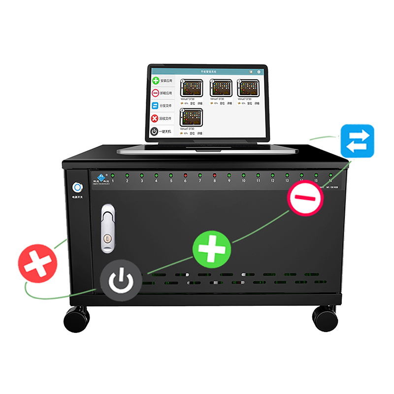 產品詳細介紹品牌:際慶科技 型號: SYNC16 Sync 16 招投(應標)參數: 功能參數: 1、16口直流充電USB 5V2.4A且每口穩定兼容HUB數據傳輸功能并對應配16條綠色數據線(充電IC芯片智能識別平板、手機等設備所需要的電流,安全、穩定、高效); 2、★每口獨立充電并具備智能LED轉燈功能(紅燈:充電狀態 中,綠燈:充滿/未連接),且有對應的數字序號; 3、★金屬按鈕開關,可過15A以上大電流,兼具電源開關和通電指示功能,單80mm風扇,搭配智能溫控系統,30℃±8自動啟停; 4、★主動式PEC節能開關電源,柜內置十重安全保護①雷擊保護②浪涌保護③過載保護④漏電保護⑤隔離保護⑥過流保護⑦過壓保護⑧短路保護⑨過充保護⑩灌流保護; 5、★自動消毒功能,紫外線+臭氧O₃雙重消毒,搭配金屬按鈕開關,啟動25min后自動關閉(選配項); 6、★定時充電具有電子顯示屏/多組設置/精準定時/倒計時設置(根據使用習慣隨意設定啟停時間段)(選配項); 7、★支持數據同步功能,能批量一鍵安裝和卸載APP,支持文件分發、文件刪除、一鍵關機等智能化管控,監測設備實時充電狀態和電量等(選配項)。 結構參數: 1、★外形尺寸≤ 552*330*328mm(含腳輪),工位容積為320*200*25mm ,頂邊圓弧(≥R8)設計; 2、★兩側設有ABS工程提手,柜體配裝 4個2寸帶剎車靜音腳輪(高度60mm); 3、★一層式全黑16工位設計,配裝ABS綠色隔斷,單開前門鎖,左側艙為電源管控封閉區; 4、★門板透明視窗部分與內部充電LED燈一一對應,且有相應的數字序號,前門板與側板設有對流孔,通風散熱。 產品資質: ①★整機CCC認證(原廠蓋章證明) ②★具有商標(國際分類20和9)證書(原廠蓋章證明) ③★具有軟件著作權(原廠蓋章證明) ④★具有ISO9001:2015質量管理體系認證(原廠蓋章證明) ⑤★具有產品專利證書(原廠蓋章證明) ⑥★具有AAA企業信用等級證書(原廠蓋章證明)