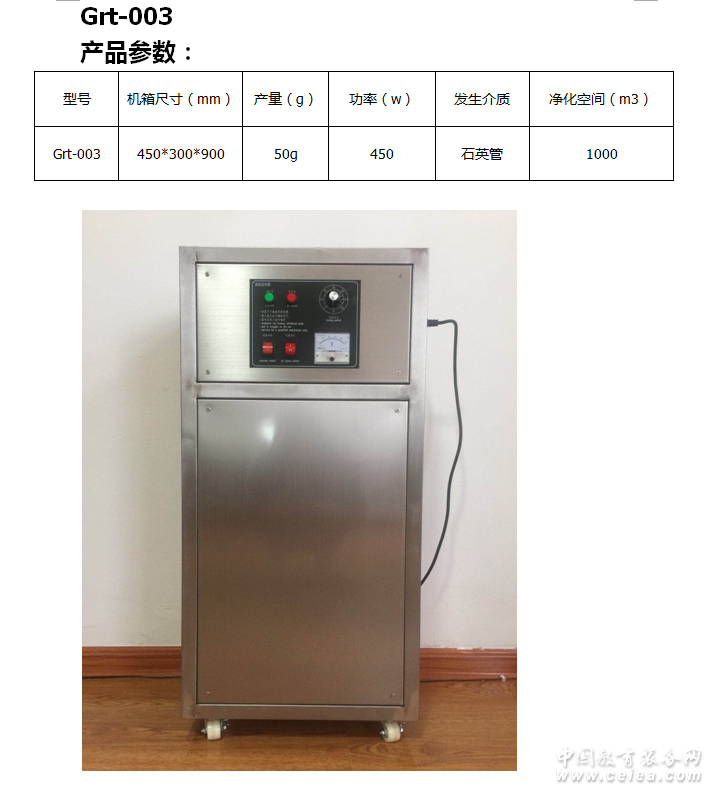 型號 臭氧產量 臭氧濃度 功率 使用電源 機身尺寸 凈化面積 冷卻方式 氣源 Grt-980T 80g 15-30mg/L 850 220v/50hz 45*30*90cm 1600m3 風冷 空氣 |