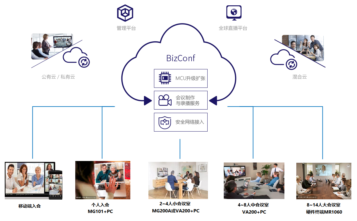 根據不同的應用場景,可搭配不同的攝像機/一體化通訊終端設備,滿足移動終端、個人桌面、小型會議室、中型會議室以及大型會議室的音視頻會議的需求,實現全場景覆蓋。