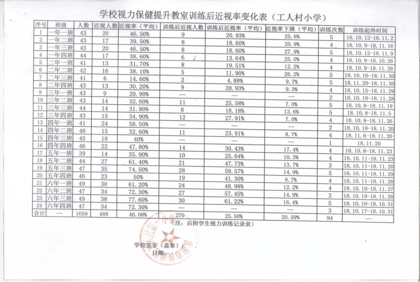 鐵西工人村第一小學參與視力提升訓練的學生總計1059名,30天的時間,在不耽誤學校正常排課的前提下,每人進行3到5次視力提升訓練,近視人數從488名下降到270名,近視率從原來的46.08%下降到25.49%,平均下降了20.59%。