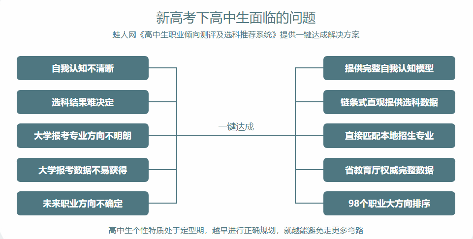 產品詳細介紹《高中生職業傾向測評及選科推薦系統》全國首創,配合山東省教育廳獨立研發。引進國外先進理論進一步融合,測評工具更科學。獲山東省教育廳及多所高中名校首肯與推薦。著眼于學生的個性,客觀理性幫住學生選擇適合科目。自2018年正式面市以來,由省內外55萬高中生親測,近500所高中學校實際檢驗,蛙人網進入40多所高中學校全方位指導,面向省內外各市教育局開展系統培訓說明會達20余次。