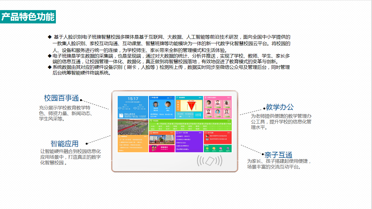 產(chǎn)品詳細(xì)介紹電子班牌是云平臺(tái)、云服務(wù)器為基礎(chǔ),采用區(qū)域?qū)嵤┕芾恚瑢?shí)現(xiàn)大數(shù)據(jù)、資源共享,有利于學(xué)校信息化建設(shè)和交流,也更易操作管理、數(shù)據(jù)更安全可靠,有效降低學(xué)校使用成本。電子班牌以班級文化建設(shè)為主,主要發(fā)揮其在中小學(xué)德育方面的積極作用。同時(shí),電子班牌也是信息技術(shù)環(huán)境的一個(gè)應(yīng)用載體,其更好的幫助老師掌握每個(gè)學(xué)生的上課情況,幫助學(xué)生積極參與班級活動(dòng)、提高集體榮譽(yù)感,幫助家長能夠?qū)崟r(shí)與孩子溝通,幫助學(xué)校更加方便進(jìn)行校園文化的建設(shè)。 電子班牌不僅是微校通智慧校園建設(shè)的重要組成部分之一,同時(shí)也是教育信息化改革過程中與學(xué)校德育深度融合的一個(gè)嘗試與探索。