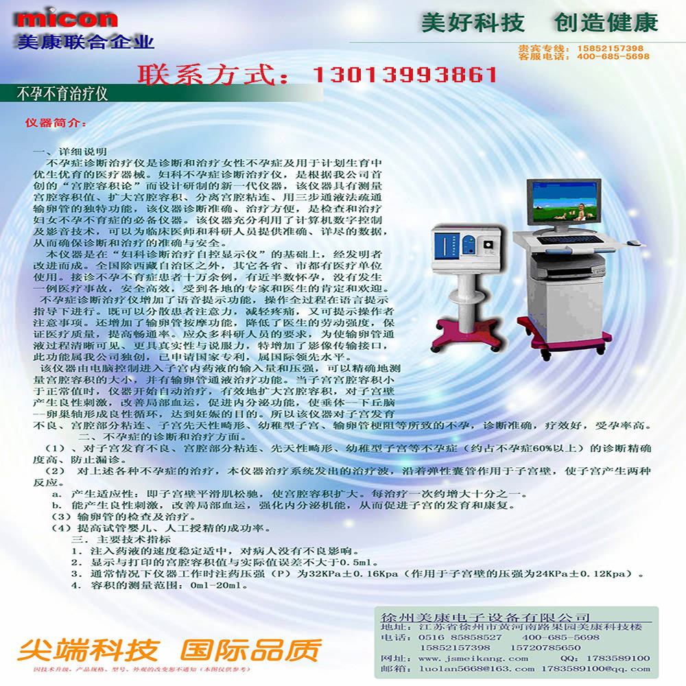 不孕不育治療儀 一、詳細說明 不孕癥診斷治療儀是診斷和治療女性不孕癥及用于計劃生育中優生優育的醫療器械。婦科不孕癥診斷治療儀,是根據我公司首創的“宮腔容積論”而設計研制的新一代儀器,該儀器具有測量宮腔容積值、擴大宮腔容積、分離宮腔粘連、用三步通液法疏通輸卵管的獨特功能,該儀器診斷準確、治療方便,是檢查和治療婦女不孕不育癥的必備儀器。該儀器充分利用了計算機數字控制及影音技術,可以為臨床醫師和科研人員提供準確、詳盡的數據,從而確保診斷和治療的準確與安全。 本儀器是在“婦科診斷治療自控顯示儀”的基礎上,經發明者改進而成。全國除西藏自治區之外,其它各省、市都有醫療單位使用。接診不孕不育癥患者十萬余例,有近半數懷孕,沒有發生一例醫療事故,安全高效,受到各地的專家和醫生的肯定和歡迎。