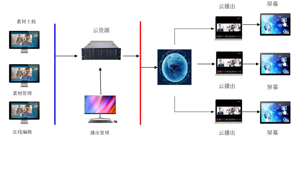 采用數字化、IP網絡設計,結合視頻、音頻、圖片、文字等多種元素在網絡上整合呈現,為用戶提供了平臺化網上資源播出系統。實現了分布式云屏播出、電教直播、教學直播、信息發布等云屏播出功能。