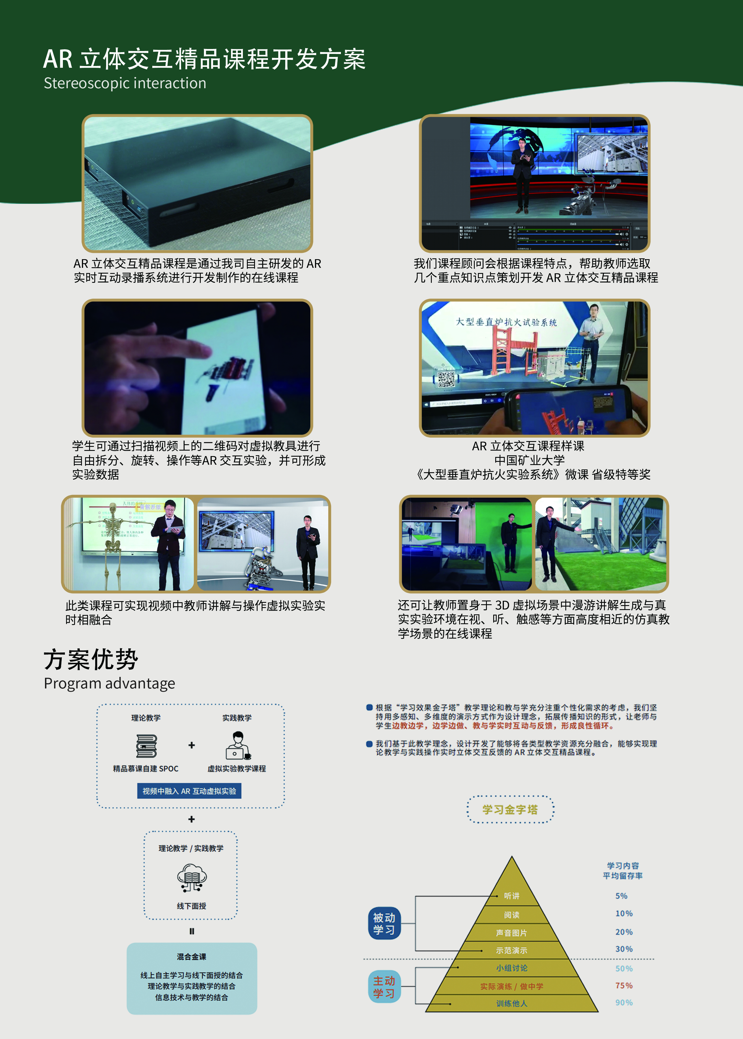 產品詳細介紹AR互動仿真系統 隨著在線學習、移動學習作為新興的教學培養方式,各學校對在線課程資源的制作需求數量和品質的要求越來越高,因此對在線課程制作的效率和呈現效果提出更高要求。 我司一直致力于服務學校在線教學視頻、動畫、虛擬仿真實驗等各類型課件資源的開發制作,積累了豐富的開發經驗和高效率的服務團隊。