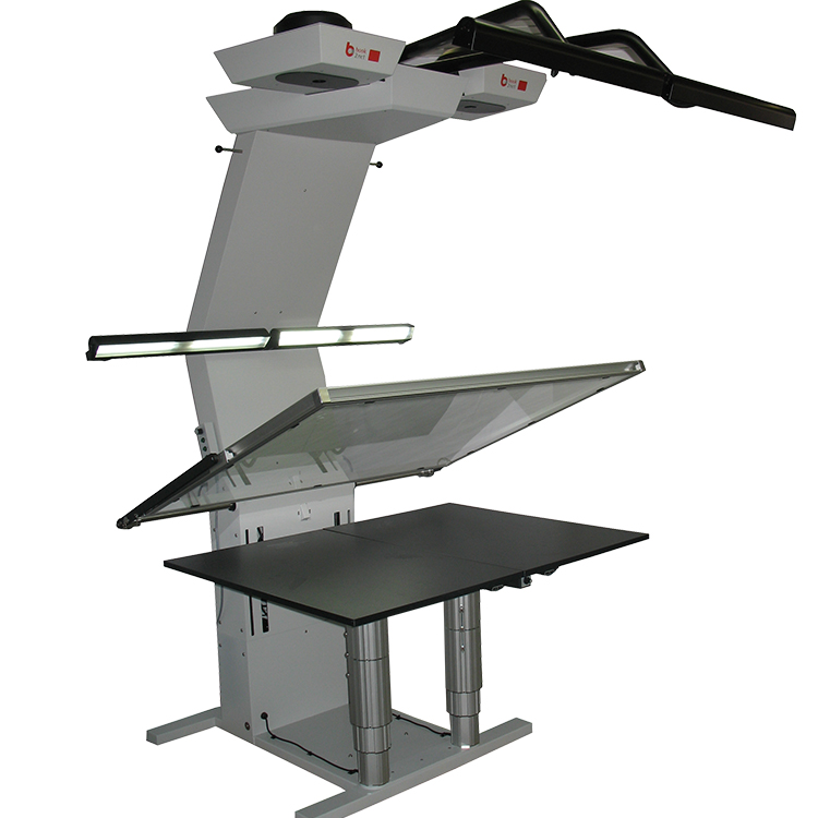 紫外線/紅外線和無(wú)臭氧照明系統(tǒng)。光照低于 2,500 lux,滿足保護(hù)生態(tài)要求。照明裝置開(kāi)發(fā)的菲涅爾透鏡是比其他制造商的照明設(shè)備具有顯著的技術(shù)優(yōu)勢(shì)。它們確保完美的光分布和照明。避免了不需要的和破壞性的漸變和反射效果,否則會(huì)在非常亮或非常暗的區(qū)域以及閃亮的材料中出現(xiàn)。 PLC 控制的電動(dòng)升降柱可將書(shū)臺(tái)的調(diào)節(jié)至 25 厘米,如果需要,可精確調(diào)節(jié)至 40 厘米。它們每個(gè)高達(dá) 180 公斤的負(fù)載能力而設(shè)計(jì),可輕松支持非常厚重的掃描。由于集成了微傳感器,它們可以使用手和腳控制進(jìn)行操作。因此,Hornet 不僅為大幅面文檔和沉重的書(shū)籍提供了極其溫和的記錄概念,而且還具有無(wú)與倫比的用戶友好性,滿足現(xiàn)代、符合人體工程學(xué)的工作場(chǎng)所的要求。