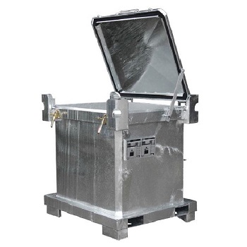 箱子底部設計有叉車孔,便于裝卸;箱子配置有蓋子,密封性好;蓋子有鎖及密封條,防止在傾倒等情況下泄露,安全性高;液體箱底部分外設有出液口。箱子蓋可以70度,90度支撐,便于物料投放。