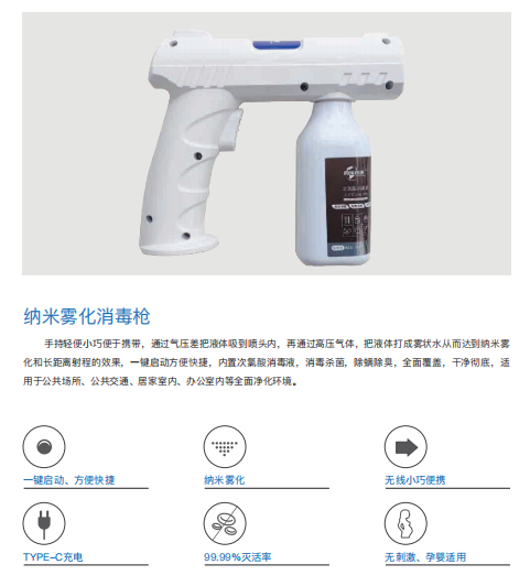 產品詳細介紹手持輕便小巧便于攜帶,通過氣壓差把液體吸到噴頭內,再通過高壓氣體,把液體打成霧狀水從而達到納米霧化和長距離射程的效果,一鍵啟動方便快捷,內置次氯酸消毒液,消毒殺菌,除螨除臭,全面覆蓋,干凈徹底,適用于公共場所、公共交通、居家室內、辦公室內等全面凈化環境。